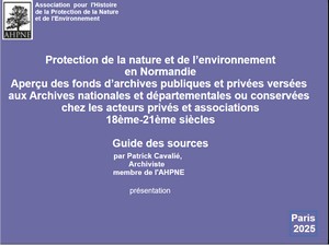 Guide réalisé par l’AHPNE en partenariat avec Archives départementales du Calvados, de l’Eure, l’Orne, la Manche et de la Seine-Maritime , mise à jour 04/06/2025 (ajout du fonds d’archives concernant les sites et le "Comité régional d’étude pour la protection et l’aménagement de la nature en Basse-Normandie", le conseil général ds ponts et chaussées et l’inspection générale, d’entretiens de personnalités). A télécharger. Cet instrument de recherche correspond à l’inventaire de plus de 6 000 dossiers conservés aux Archives départementales.