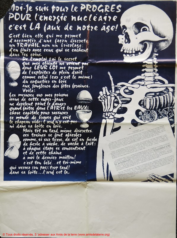 Cette affiche est la manifestation de la lutte contre l’implantation d’une nouvelle nucléaire sur la côte bretonne. Elle est lancée par le CRIN (Comité Régional d’Information Nucléaire), créé dans les années 1970 quand plusieurs sites de la côte ouest sont pressentis pour y implanter des centrales. Son objectif est de sensibiliser la population à l’usage de l’énergie nucléaire et ses conséquences. Elle n’a pas d’appartenance politique. Après l’abandon des projets, le CRIN a persisté pour lutter contre un problème devenu mondial.