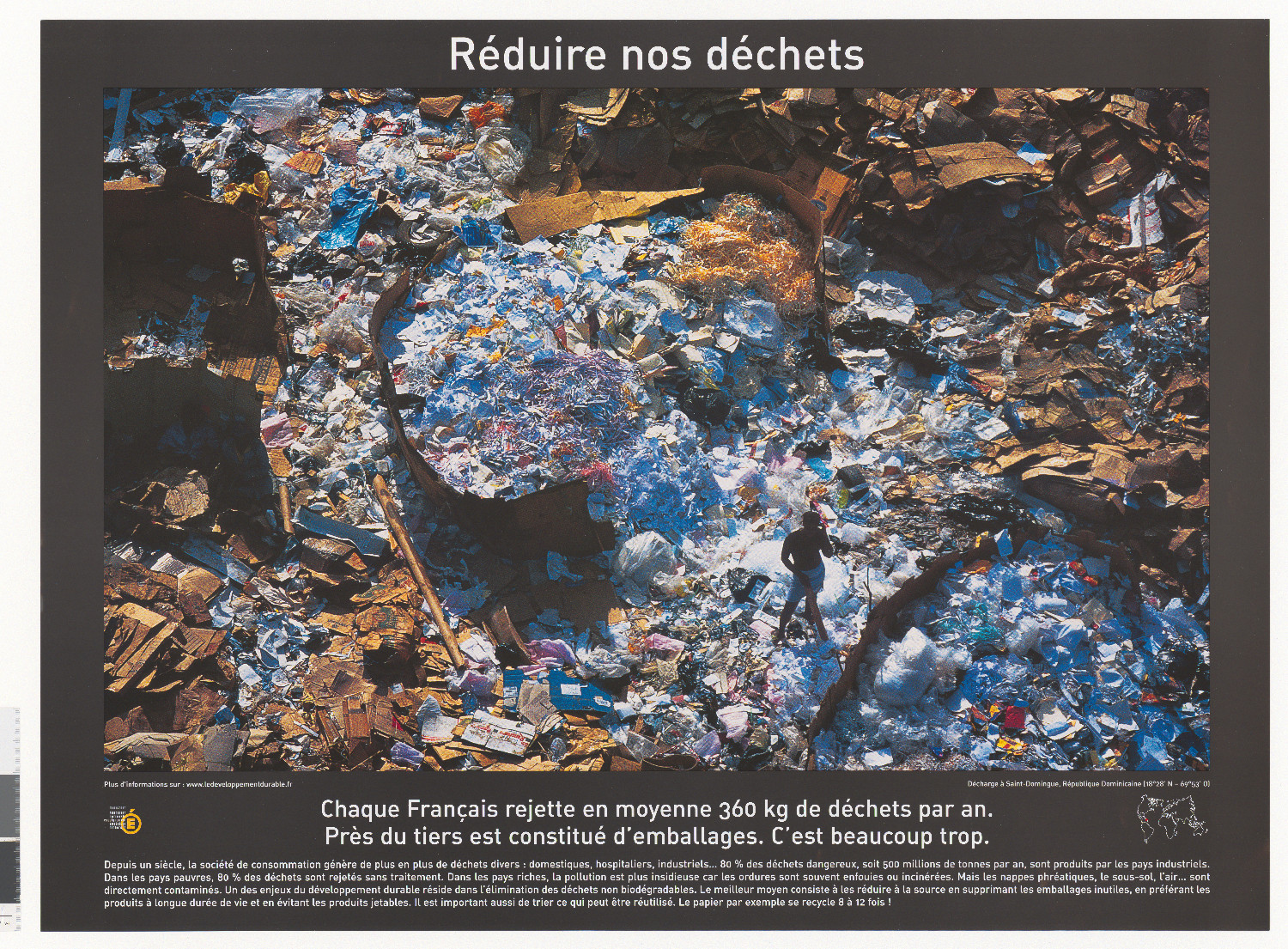 En France, en 2006, le tiers des déchets est constitué d’emballages. L’exposition pédagogique « Le développement durable, pourquoi ? », en partenariat avec le ministère de l’Éducation nationale, de l’Enseignement supérieur et de la Recherche dans 50 000 écoles, collèges et lycées, nous montre l’interconnexion des milieux et des vivants, ainsi que l’importance de les préserver. Ici, ce sont les travers de la surproduction et de la surconsommation qui sont décriés.