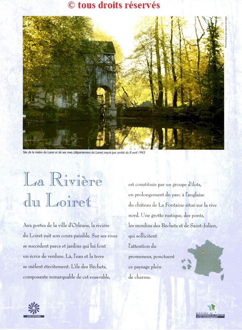 20060546/8 « La Rivière/du Loiret/[...] », Parimage (Ed.), [1999], photo de la Photothèque des espaces protégés, [vue du Loiret et ses rives dans le département du Loiret, plus logo], 1 ex., 40 x 30 cm, couleur. |