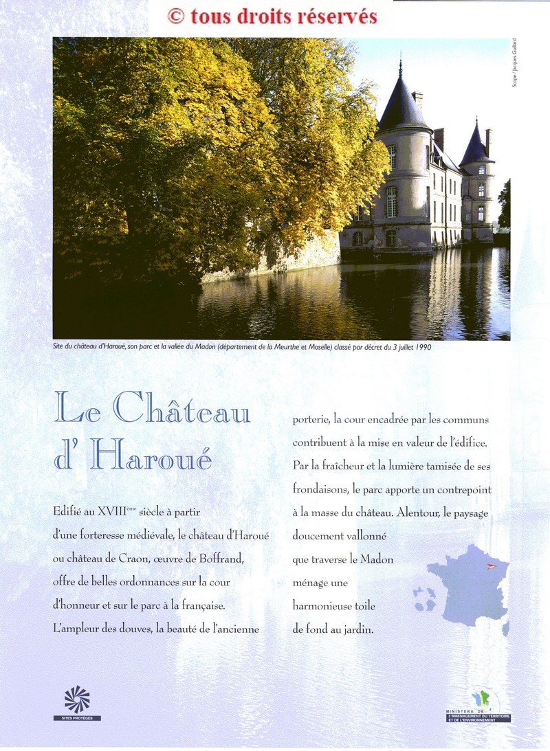| 20060546/11 « Le Château/d’Haroué/[...] », Parimage (Ed.), [1999], photo de Jacques Guillard, [vue du château d’Haroué, son parc et la vallée du Madon en Meurthe-et-Moselle, plus logo], 1 ex., 40 x 30 cm, couleur. |