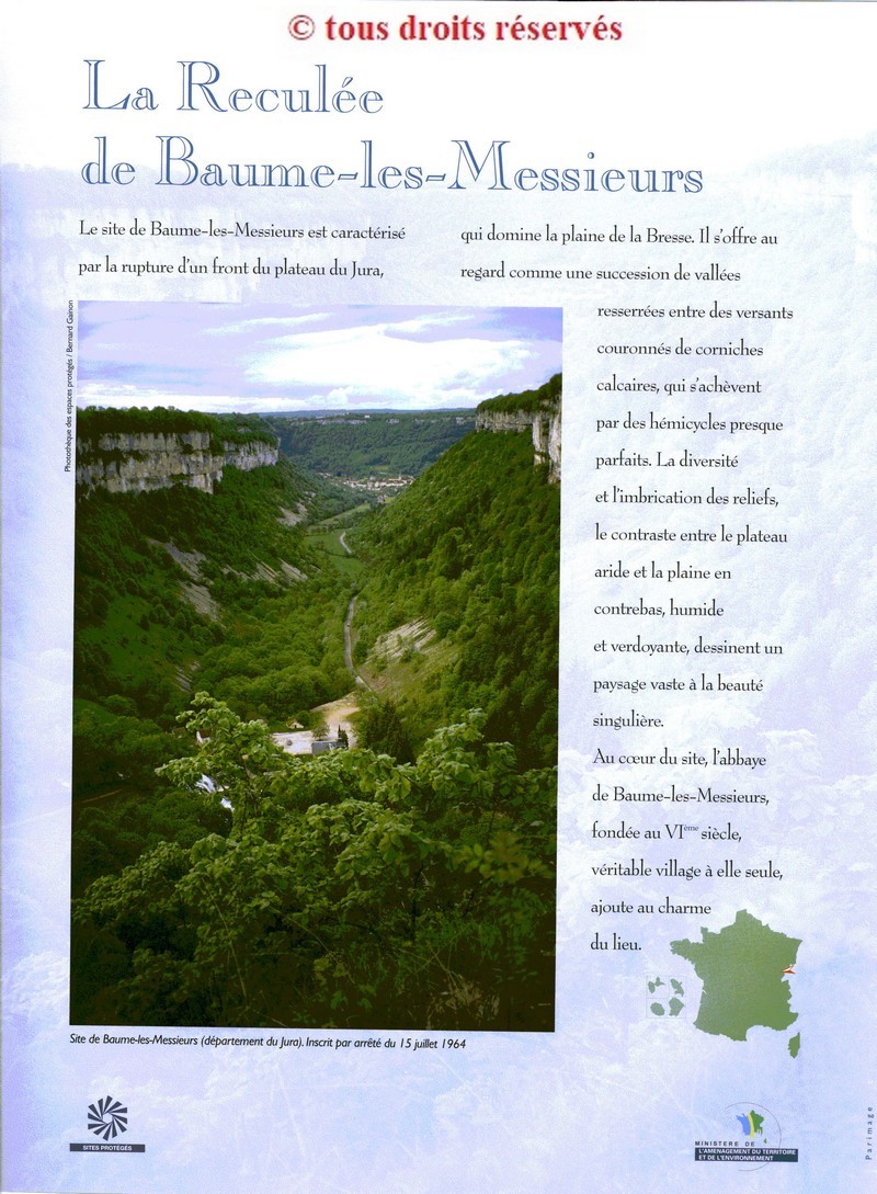 20060546/14 « La Reculée/de Baume-les-Messieurs/[...] », Parimage (Ed.), [1999], photo de Bernard Gainon et Photothèque des espaces protégés, [vue de Baume-les-Messieurs dans le Jura, plus logo], 1 ex., 40 x 30 cm, couleur. |