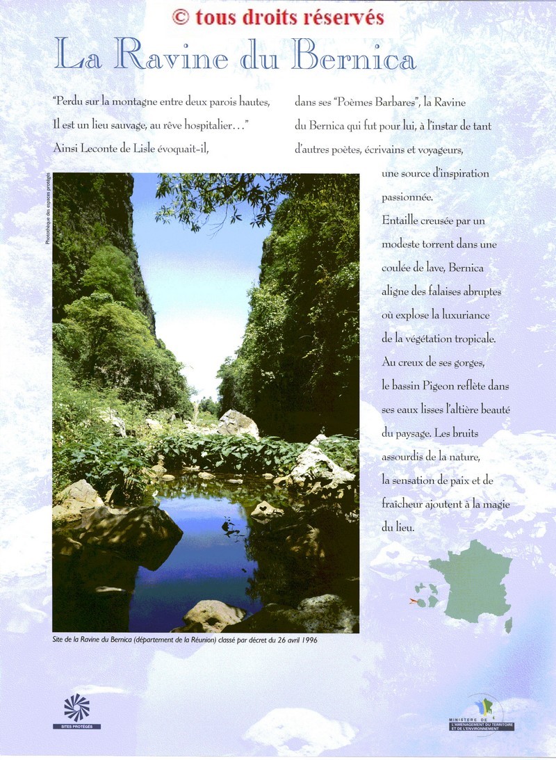 | 20060546/27 « La Ravine du Bernica/[...] », Parimage (Ed.), [1999], photo de la Photothèque des espaces protégés, [vue de la Ravine du Bernica à la Réunion, plus logo], 1 ex., 40 x 30 cm, couleur. |