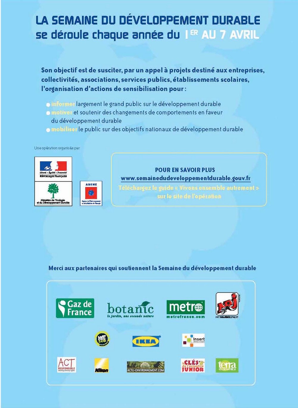 « Merci aux partenaires qui soutiennent la Semaine du développement durable », Ministère de l’écologie et du développement durable, Agence de l’environnement et de la maîtrise de l’énergie (ADEME), 60x80 cm, couleur, 2007