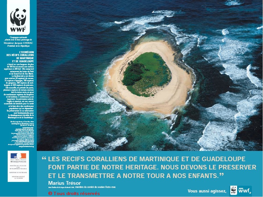 | 20070117/1 « L’écorégion des récifs coralliens de la Martinique et de la Guadeloupe - " Les récifs coralliens de la Martinique et de la Guadeloupe font partie de notre héritage. Nous devons le préserver et le transmettre à notre tour à nos enfants.", Marius Trésor, Demi finaliste de la Coupe du Monde 1982, membre du comité de soutien Outre-mer », 60x80 cm, couleur, 2004 |