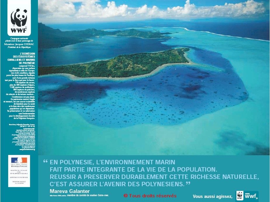 20070117/10 « L’écorégion des écosystèmes coralliens et marins de Polynésie - " En Polynésie, l’environnement marin fait partie intégrante de la vie de la population. Réussir à préserver durablement cette richesse naturelle, c’est assurer l’avenir des Polynésiens. ", Mareva Galanter, miss France 1999, actrice, membre du comité de soutien Outre-mer », 60x80 cm, couleur, 2004 |
