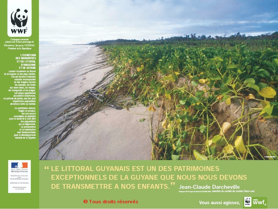 20070117/2 « L’écorégion des mangroves et du littoral d’Amazonie et de Guyane - " Le littoral guyanais est un des patrimoines exceptionnels de la Guyane que nous nous devons de transmettre à nos enfants. ", Jean-Claude Darcheville, vainqueur de la coupe de France 2002, membre du comité de soutien Outre-mer », 60x80 cm, couleur, 2004 |