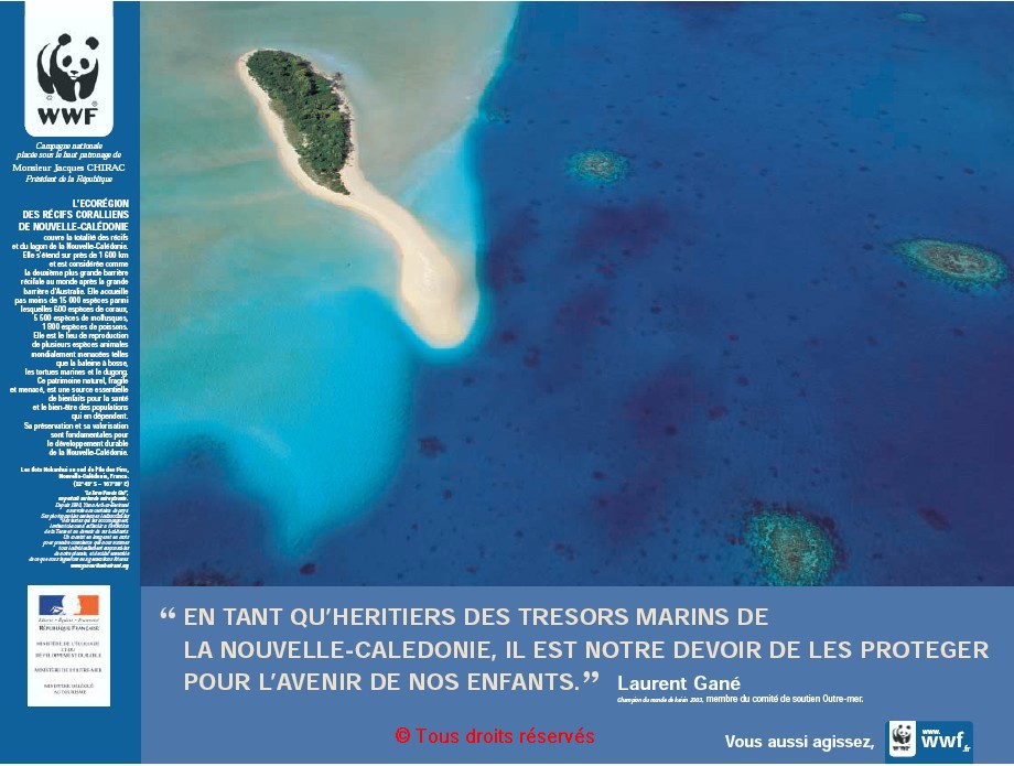 | 20070117/7 « L’écorégion des récifs coralliens de Nouvelle-Calédonie - " En tant qu’héritiers des trésors marins de la Nouvelle-Calédonie, il est de notre devoir de les protéger pour l’avenir de nos enfants. ", Laurent Gané, champion du monde de keirin 2003, membre du comité de soutien Outre-mer », 60x80 cm, couleur, 2004 |