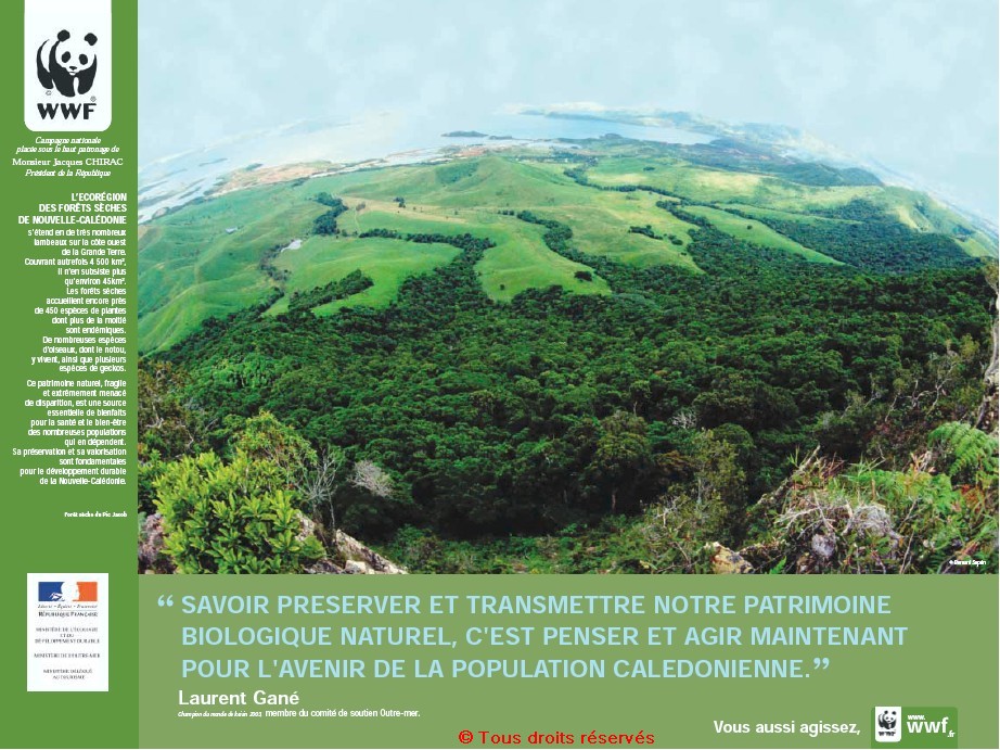 | 20070117/9 « L’écorégion des forêts sèches de Nouvelle-Calédonie - " Savoir préserver et transmettre notre patrimoine biologique naturel, c’est penser et agir maintenant pour l’avenir de la population calédonienne. ", Laurent Gané, champion du monde de keirin 2003, membre du comité de soutien Outre-mer », 60x80 cm, couleur, 2004 |