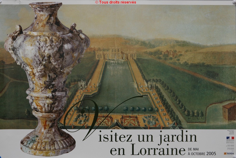 20070315/8 Visitez un jardin en Lorraine de mai à octobre 2005, illustration "Jardins de Commercy, vase de jardin" Musée Lorrain, Ministère de la Culture, DIREN Lorraine, Comité régional du tourisme, 40x60 cm, couleur, 2005 |